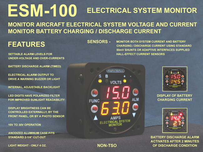 The ESM-100 provides accurate, simultaneous readings of the current draw and voltage of an aircraft's electrical system in a lightweight digital instrument. The ESM-100 is designed to monitor two separate currents, the battery charging current and the system "Master Switch" current. Alarm levels can be set for low system voltage and high system and battery charging currents. The ESM-100 will also show an alarm condition if it senses a battery discharge of more than 2 minutes. The ESM-100 displays information on a large, bright 3-digit over 3-digit LED display. The upper display always shows system voltage and, while the lower display can be switched to show either system or battery charging current, both currents are always being monitored for alarm conditions.